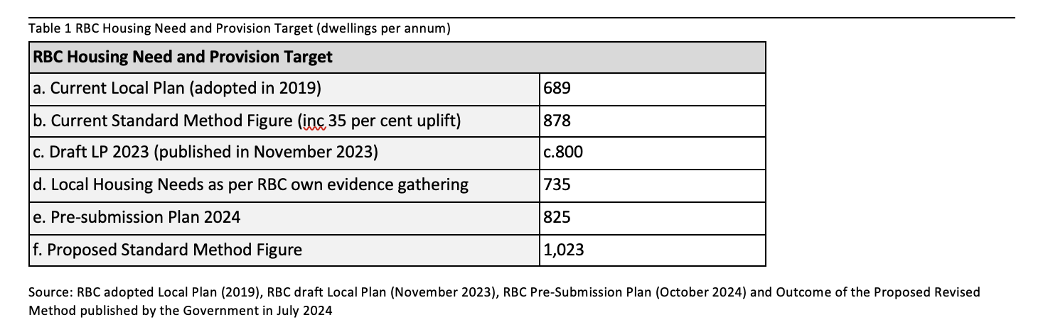 However, this still lags behind the housing need figure calculated by the existing Standard Method (item b), and significantly behind the need figure generated by the draft standard methodology (item f) consulted on by the new Labour Government. Such is the Government’s drive for housing, RBC will have to provide ‘exceptional circumstances’ for why the new Local Plan falls short of the higher Standard Method housing need (b) even if it progresses in advance of the NPPF being amended.
