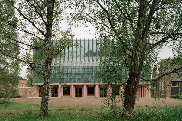 Homerton’s new space was inspired by the Arts and Crafts architectural movement, with a façade of handcrafted green ceramic tiles covering the V-shaped roof, internally making a feature out of the chestnut butterfly trusses, reflecting on traditional collegiate halls, with other parts of the building using colours already found throughout the college, largely red brick, and red sandstone.