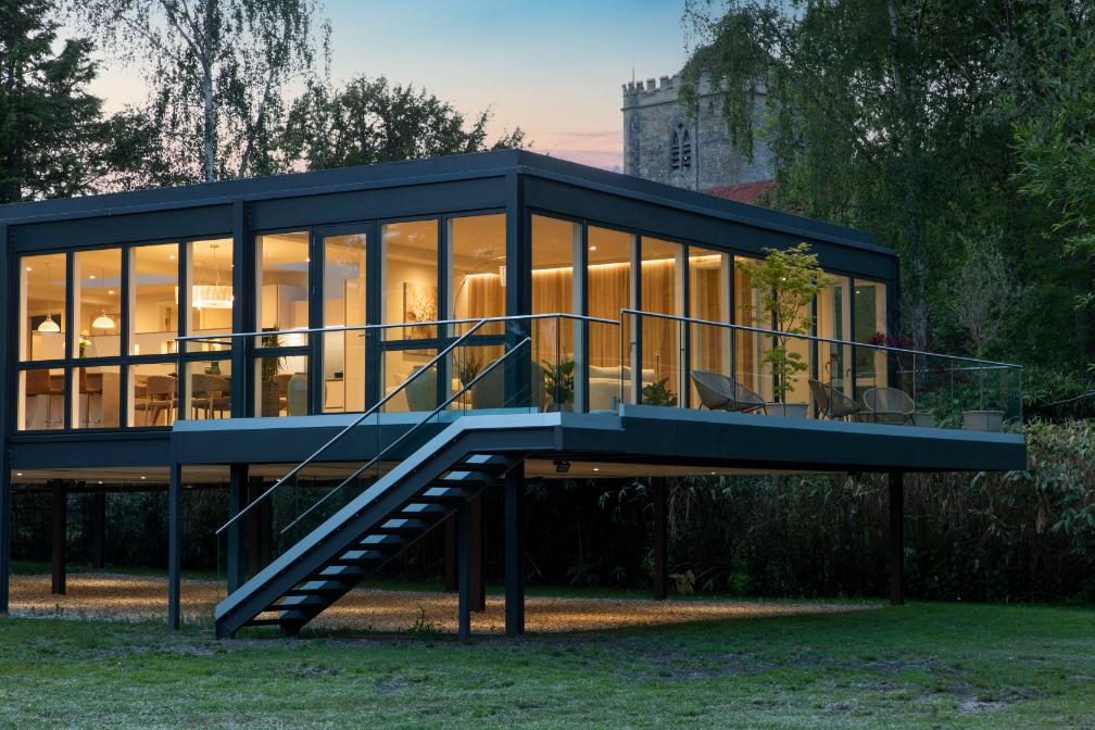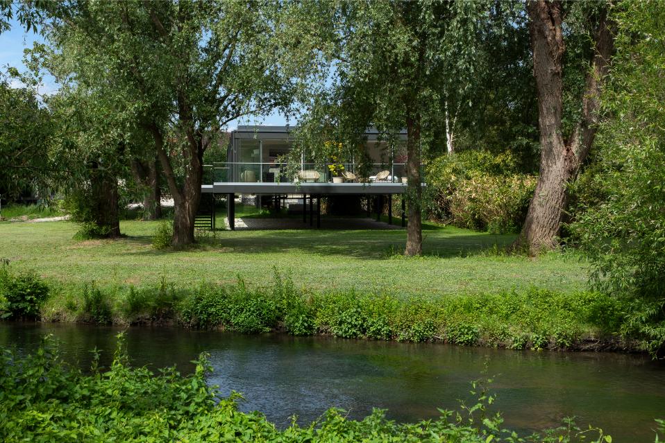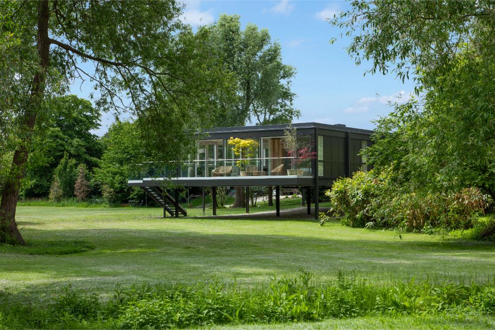 Set in a striking location in the shadow of Dorchester Abbey, on the banks of the River Thame, it is a single storey home, set on eight-foot steel stilts. Its design was inspired by the renowned Ben Rose House in Highland Park, Chicago, a 1950s modernist home overlooking a ravine, famous for featuring in the 1986 film, Ferris Bueller’s Day Off.