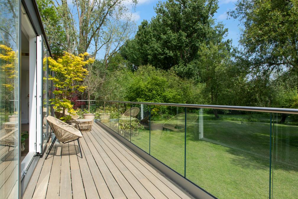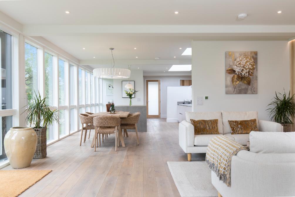 The original lateral layout has been retained, with the open plan kitchen, dining and living area becoming a highlight. Engineered oak floors extend throughout and the floor-to-ceiling windows span two sides of the house, while the wrap-around balcony is directly accessible from the sitting room.
