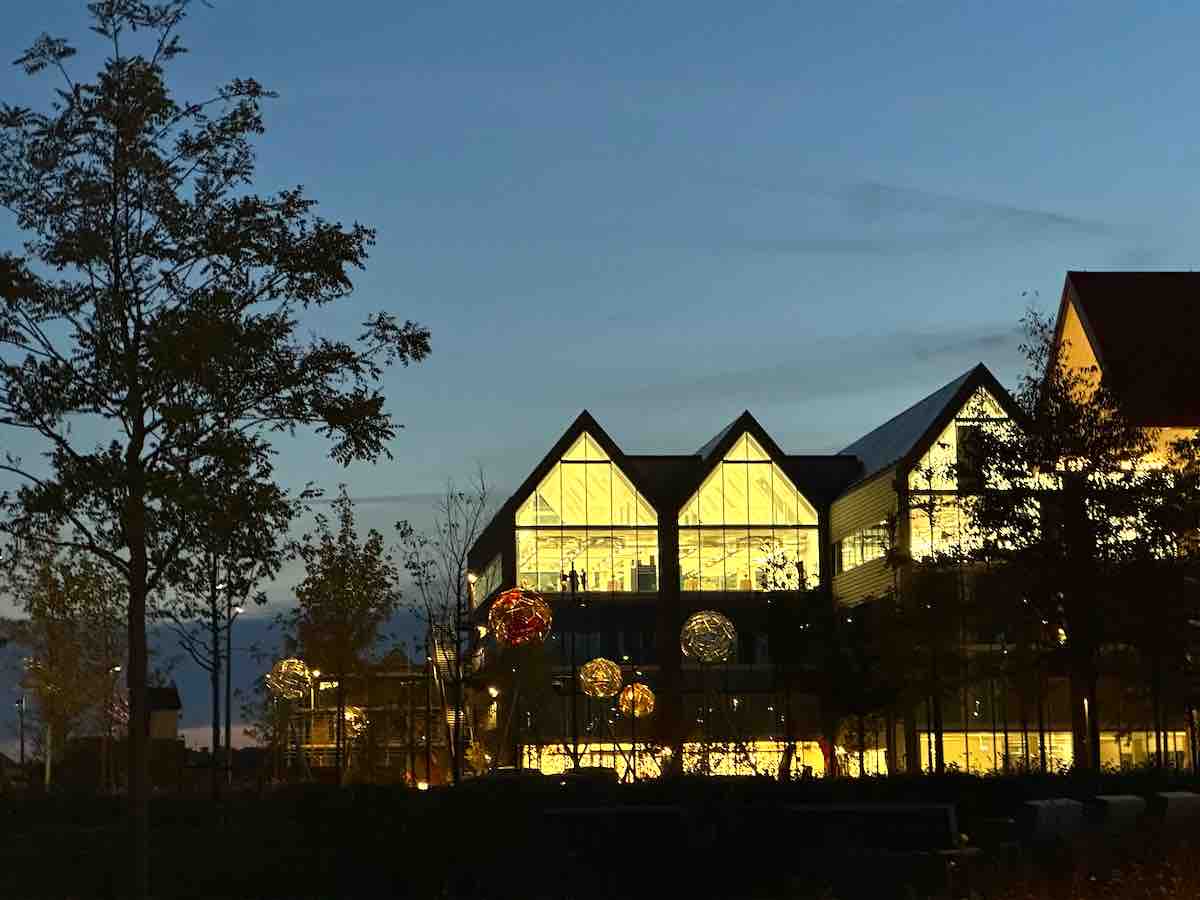 The lights are coming on and the ‘planets’ in the landscaping are starting to glow as dusk descends. Stroll along the pathways between them and look back at the openness of the glass and the illuminated floors. We are living in dark times but this place seems to be saying: “Here, we can be one of the beacons the world needs if we are to redress the balance and remain true to the ethos of enlightenment and discovery as the pendulum swings us away from ignorance and autocracy.”